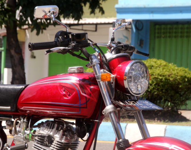 Sang owner lebih suka tampil menyamar, persis dengan representasi pribadinya, low profil tapi padat berisi. Meskipun berparas retro classic, hasil pemakaian tangki CB Glatik tahun 79 dan jok custom, tapi soal inovasi performa mesin, mungkin kuda besi yang satu ini juga layak di uji coba di trek 1200 meter, meskipun request sang empunya hanya sebatas menu touring.
