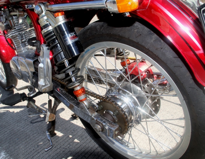 Dipadu swing arm Kaze dan double sok KTC 32 cm. Bahkan untuk pengereman, turut diupgrade, melalui pemakaian cakram depan berikut caliper RCB, dicangkok pada tromol KLX 150.