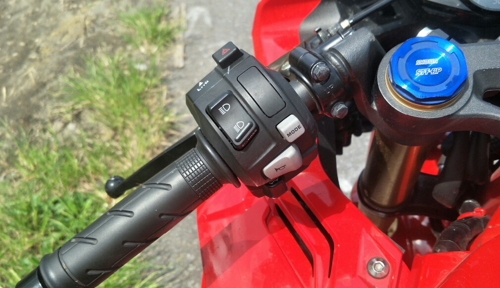 Sebagai sport canggih yang easy ride dan friendly, pada holder kiri telah disematkan switch akses merubah riding mode.