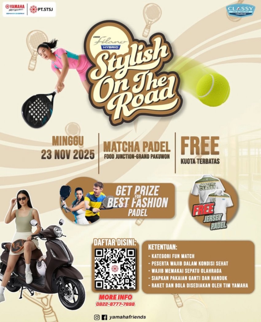 PT. Surya Timur Sakti Jatim (Yamaha STSJ) kembali melakukan aktivasi Classy Yamaha melalui gelaran “Stylish On The Road”, yang akan berlangsung pada Minggu, 23 November 2025 di Matcha Padel, Food Junction Grand Pakuwon.