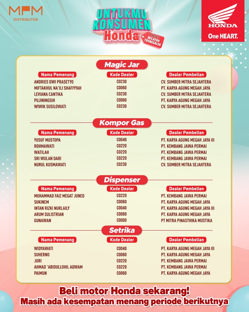 PT. Mitra Pinasthika Mulia (MPM Honda Jatim) bersama jaringan dealer Honda di wilayah Trenggalek kembali mempersembahkan apresiasi terbaik untuk konsumen setianya melalui program undian spektakuler Untukmu Konsumen Honda.
