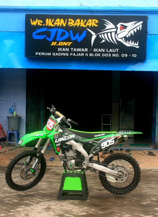 Makin spesial, saat simulasi latih tanding di sirkuit Tropodo, Krian pekan silam, Kawasaki KX 250F milik H. Ony sempat diuji coba oleh M. Rizqy crosser 85 cc potensial asal Damarsih, Sidoarjo.