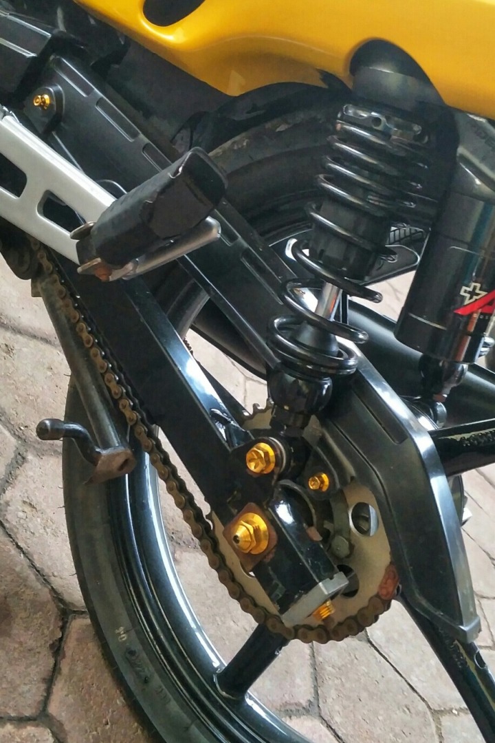 Dipadu sok belakang aftermarket dilengkapi tabung preload, khas pacuan rider road race.