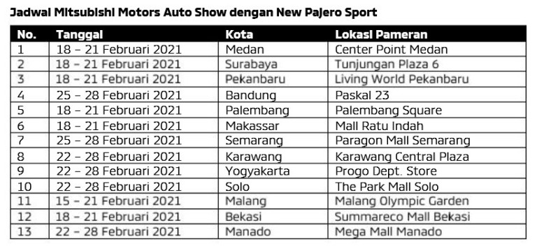 Kehadiran New Pajero Sport melalui Mitsubishi Motors Auto Show di berbagai kota besar di Indonesia, merupakan rangkaian peluncuran model baru, untuk pasar Indonesia.