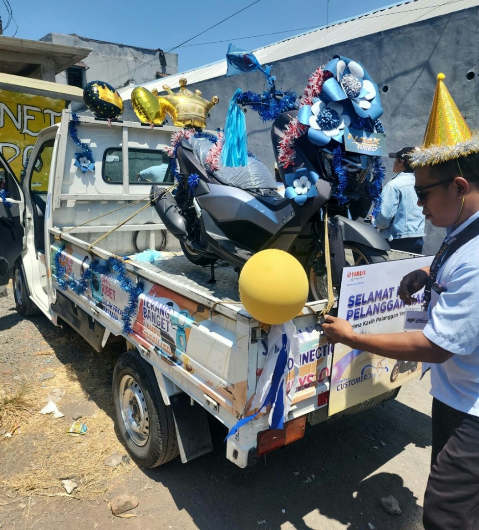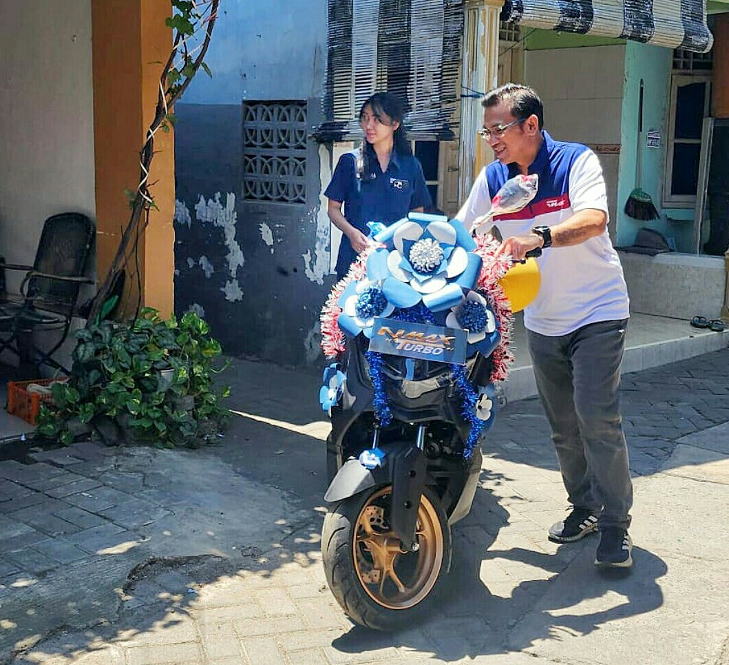 Salah satu pelanggan yang beruntung adalah Nuriyati, warga Surabaya, yang mengaku terkejut dan senang dengan kedatangan tim Yamaha ke rumahnya.