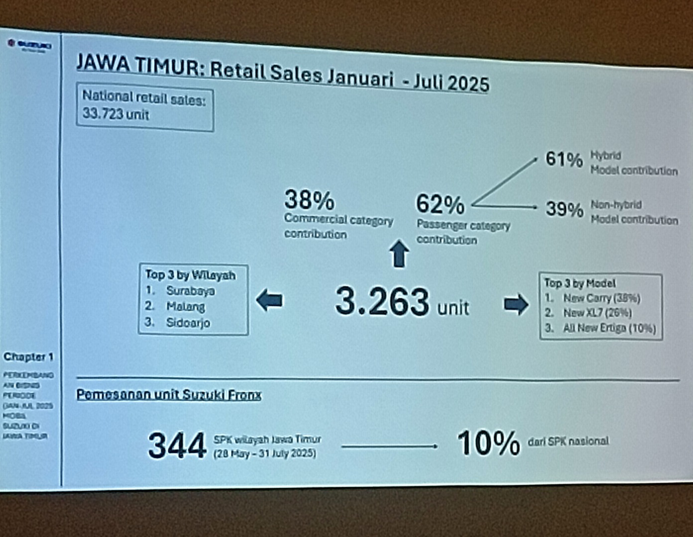 Selama Januari hingga Juli 2025 saja, PT. Suzuki Indomobil Sales (SIS) mencatatkan penjualan mobil lebih dari 3.200 unit pada wilayah Jatim, dengan komposisi kategori mobil penumpang 62% dan komersil 38%.