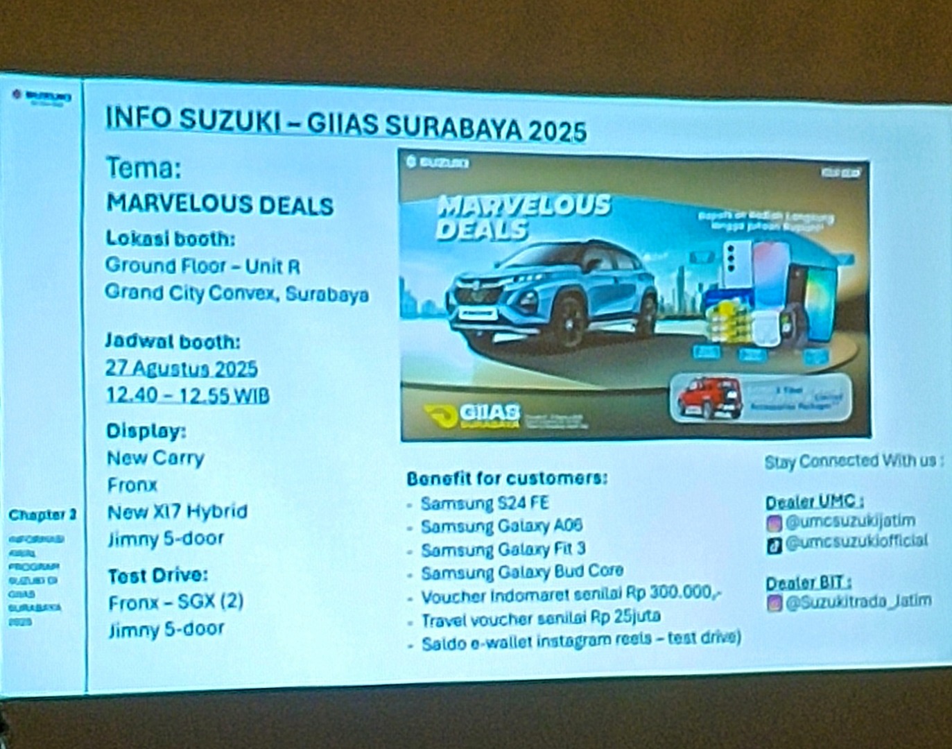 “Beragam penawaran spesial, mulai dari paket pembiayaan ringan hingga hadiah langsung, kami siapkan agar setiap kunjungan ke booth Suzuki meninggalkan kesan mendalammendalam".