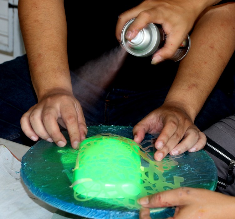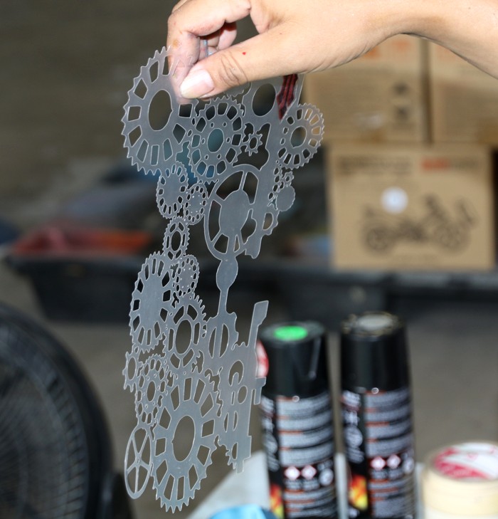 Bagi yang terbiasa pakai steinsils, cukup dua tangan. Tapi yang belum terbiasa, boleh dibantu adik atau paman, yang kebetulan gandrung modifikasi. Kuncinya, pastikan lembaran steinsils yang akan dipakai jangan sampai berongga.