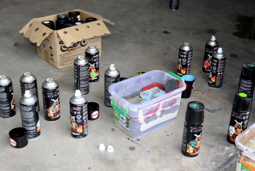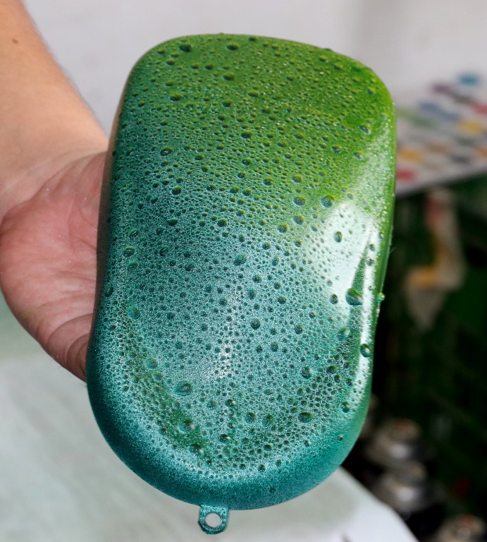 Setelah penyemprotan air tadi merata, lanjutkan dengan menimpanya pakai cat Samurai Paint. Ingat dan catat ya, efek buble tampaknya akan tipis saat nempel di bidang warna terang.