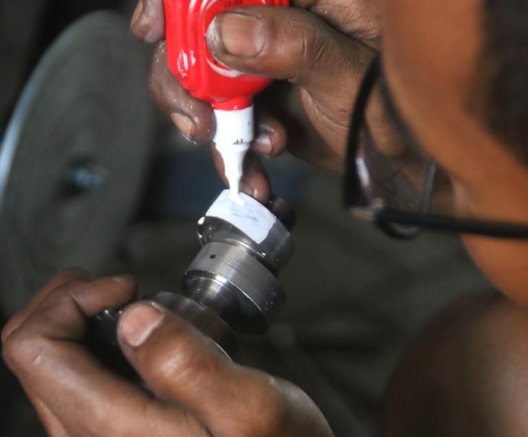 Lubang dudukan tapet atau baut stelan katup wajib simetris tangkai katup. Spesial bagian ini, Arul memakai temlar custom. Berbahan temlar Bajaj Pulsar 135 cc, kemudian dipaten pararel dengan las MIG. “Lanjut ke pemotongan salah satu tapak temlar yang tidak kontak dengan camshaft, ”tunjuk Arul.