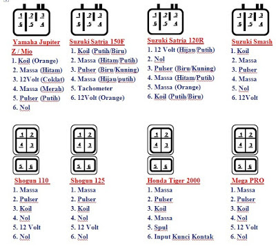 Cara membaca kaki pin CDI sangatlah mudah, dibawah itu ada tabel gambar cara bacanya di tiap tipe motor yang berbeda. Kita contohkan CDI Grand/Supra ada 5 pin yang terdiri dari Massa, Pulser, Koil, Kontak dan 12 volt positif. Urutan sesuai gambar dan telah jadi satu dalam socket bawaan standar Honda.