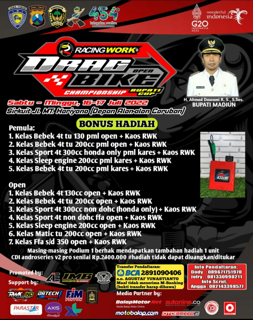 Termasuk perhelatan akbar, bertajuk "Bupati Cup Racing Work Drag Bike Openchampionship 2022, Caruban", yang fix akan dihelat selama 2 hari pada 16 - 17 Juli 2022.