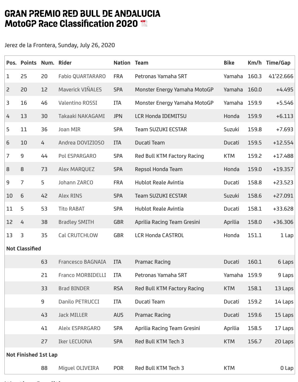Artinya, Rossi akhirnya merasakan podium lagi setelah 1 tahun 102 hari. Adapun pada MotoGP Andalusia 2020, Fabio Quartararo (Petronas Yamaha SRT) berhasil menjadi pemenang. Sementara urutan kedua diduduki rekan setim Rossi, Maverick Vinales.