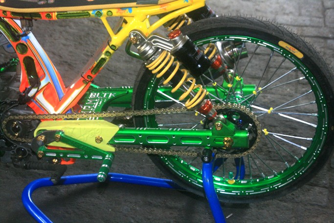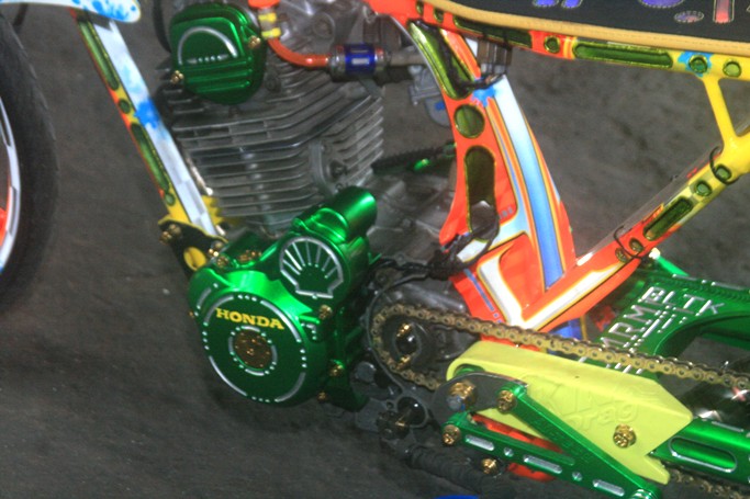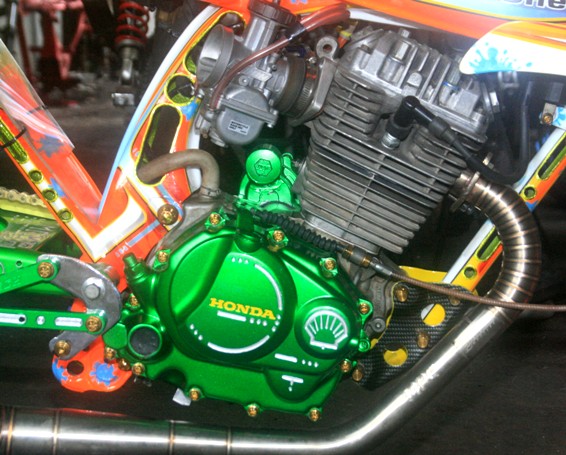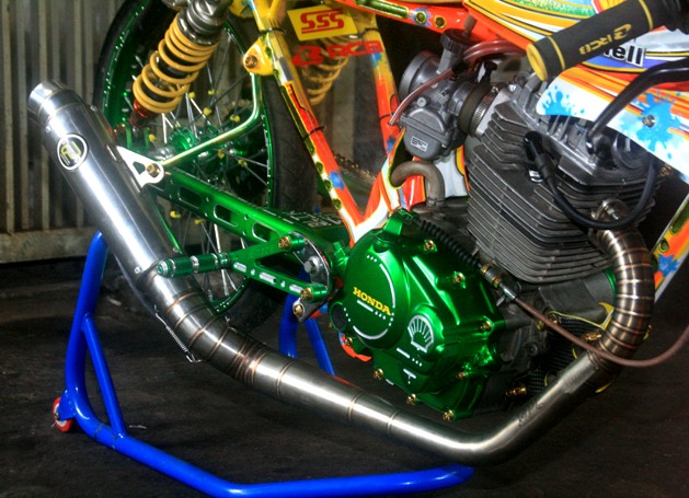 Kendati spek karapan, secara tampilan cukup eksotis. Seperti tangki custom, lengan ayun Ai Ttech, foot step Ai Tech, sok belakang KTC, sok depan Sonic RS 125, hingga custom tromol replika special engine yang dirancang mini. enea