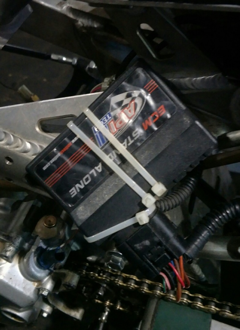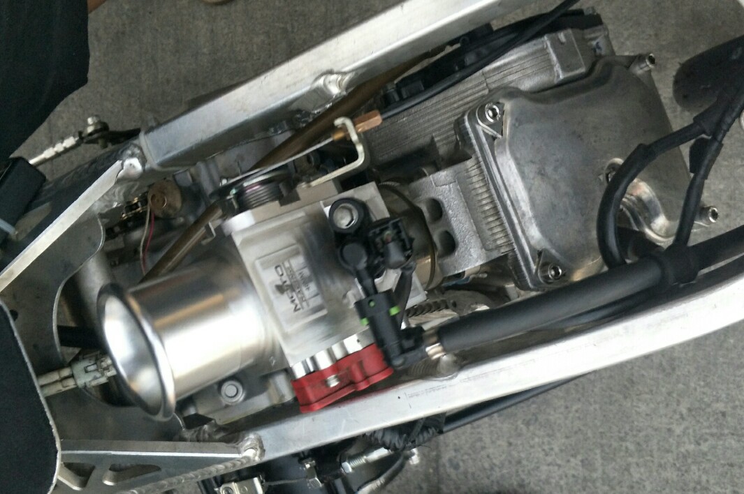 Digawangi throttle body tipe Barel dari Moto 1, dengan inlet 46 mm dan injector Denso, debit flowrate BBM avigas diplot di angka 240 cc/minute, melalui program ECU ApiTech Y15 MX King.