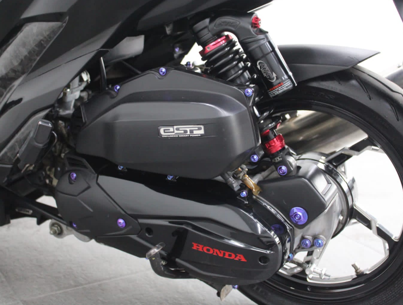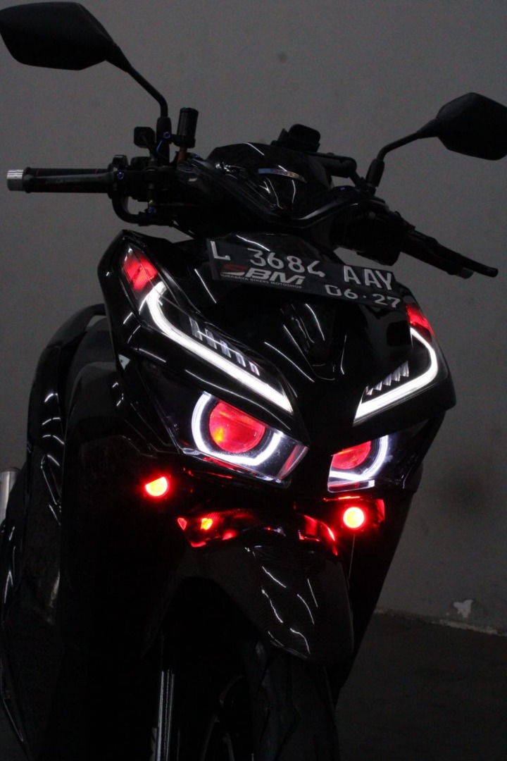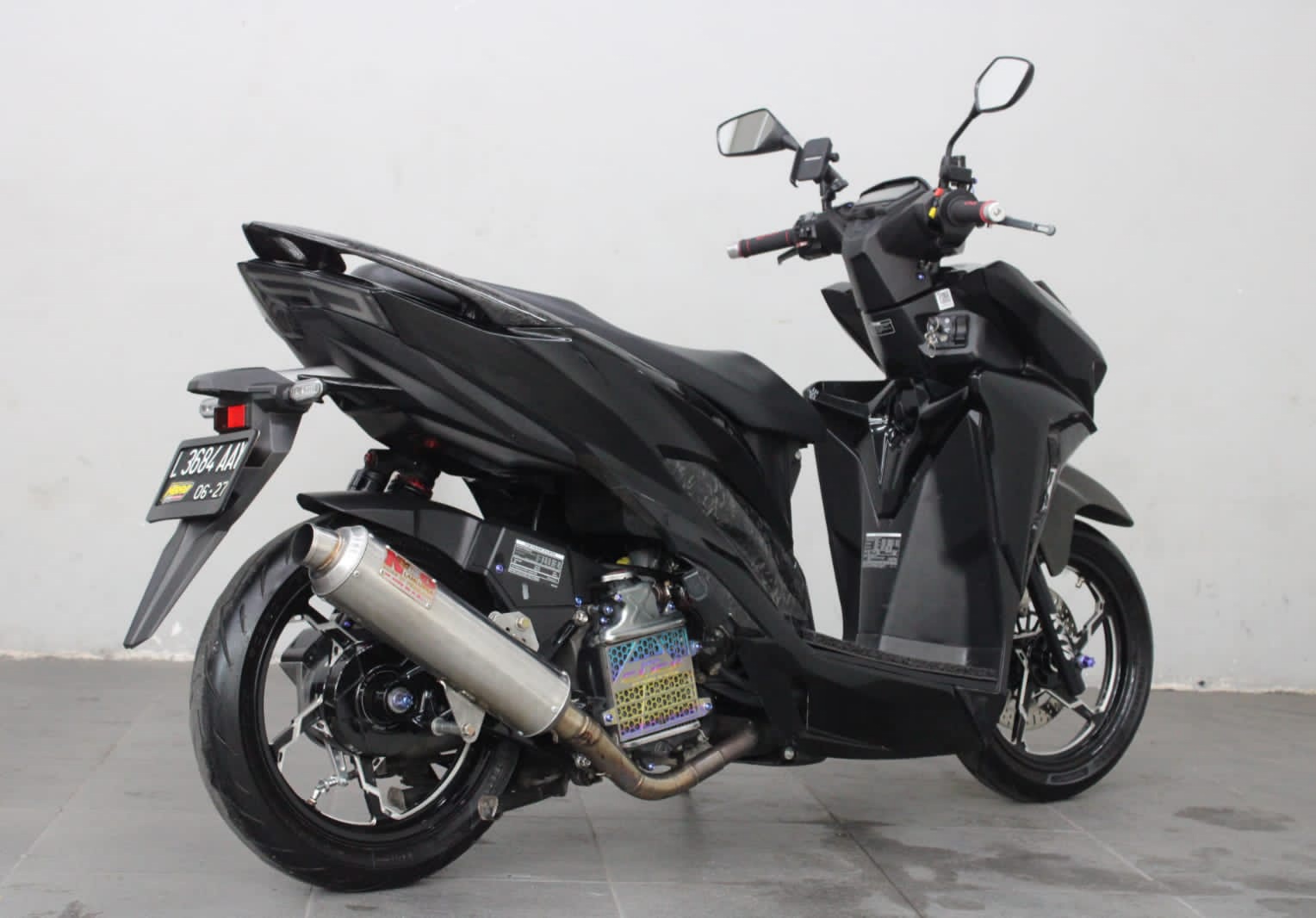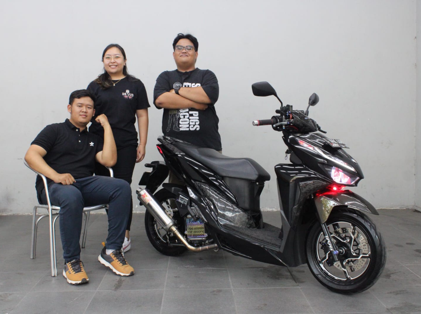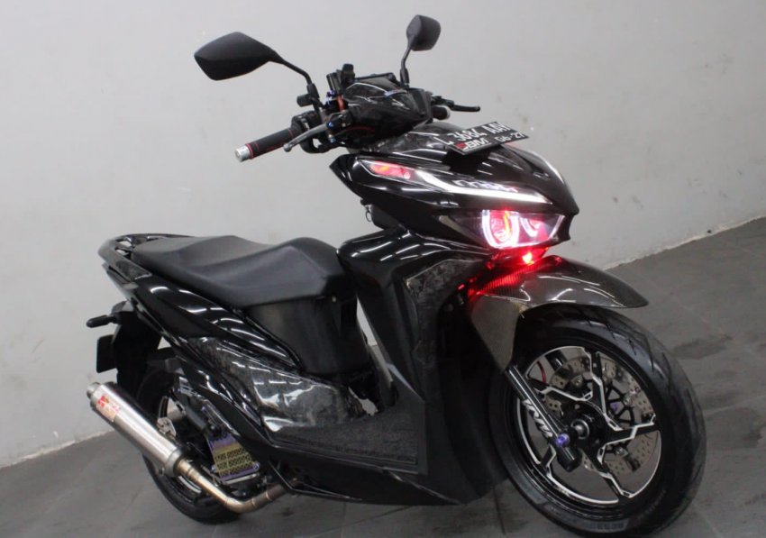 Termasuk Vario berkarbon motif terbaru, yang dipadu repaint black piano, full baut titan, hasil garapan SCT, Surabaya.