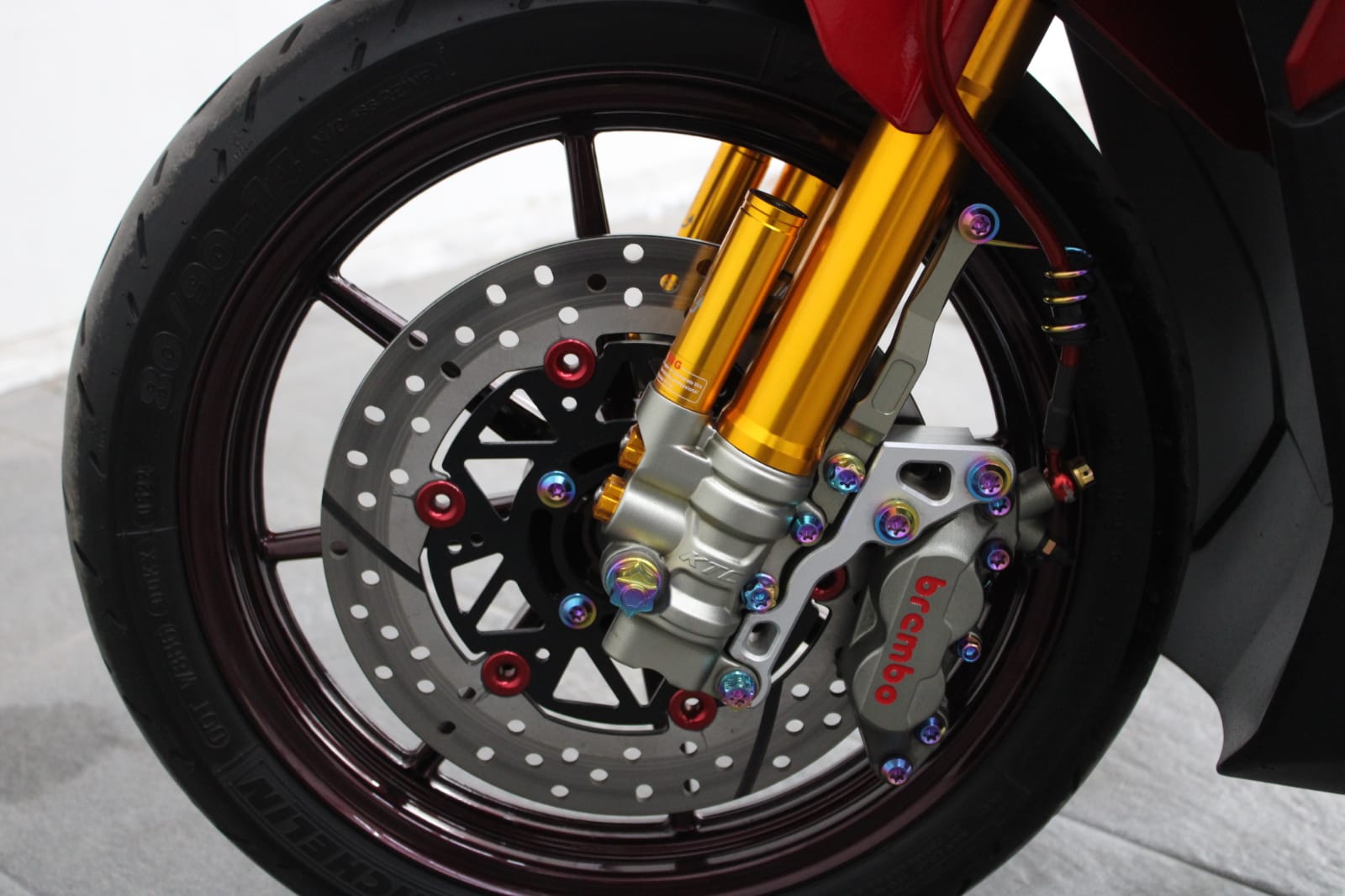Soal kestabilan di top speed, dilayani sok depan KYB Japan, bersanding cakram KTC dan caliper KTC 4 piston.