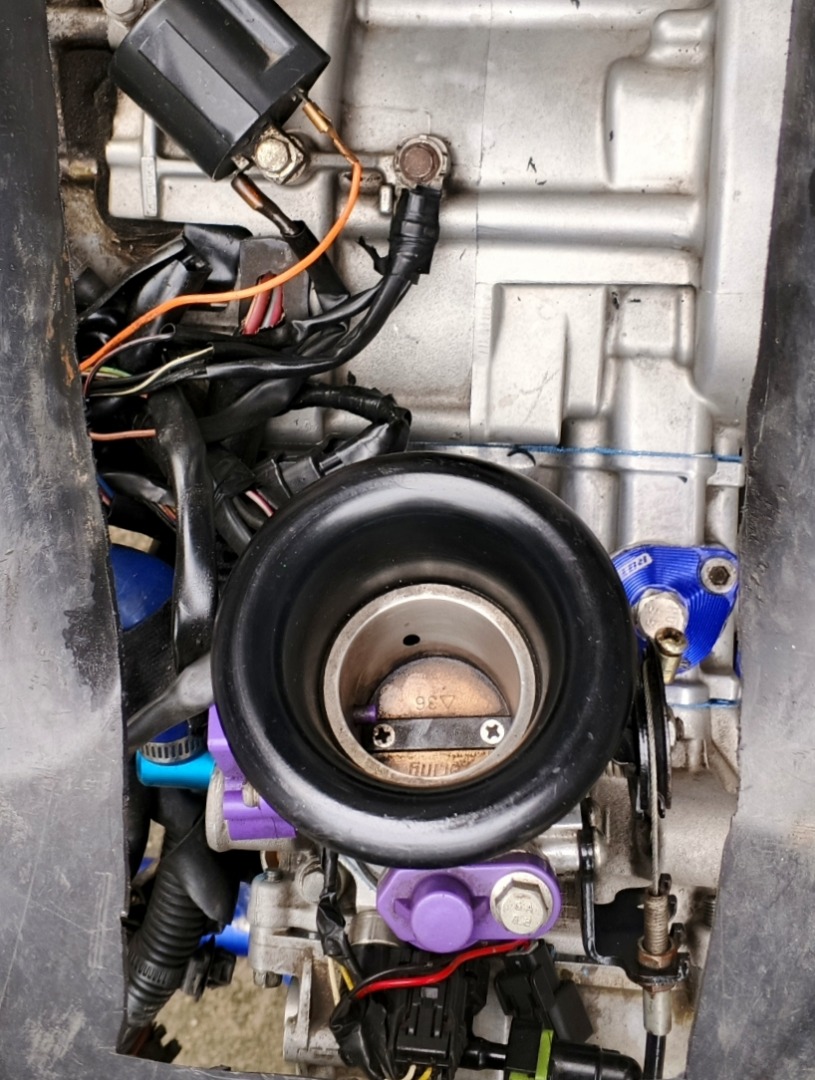 Makin spesial, penempatan throttle body yang dipinjam dari UMA 36 mm milik MX King, diinstal down draft.