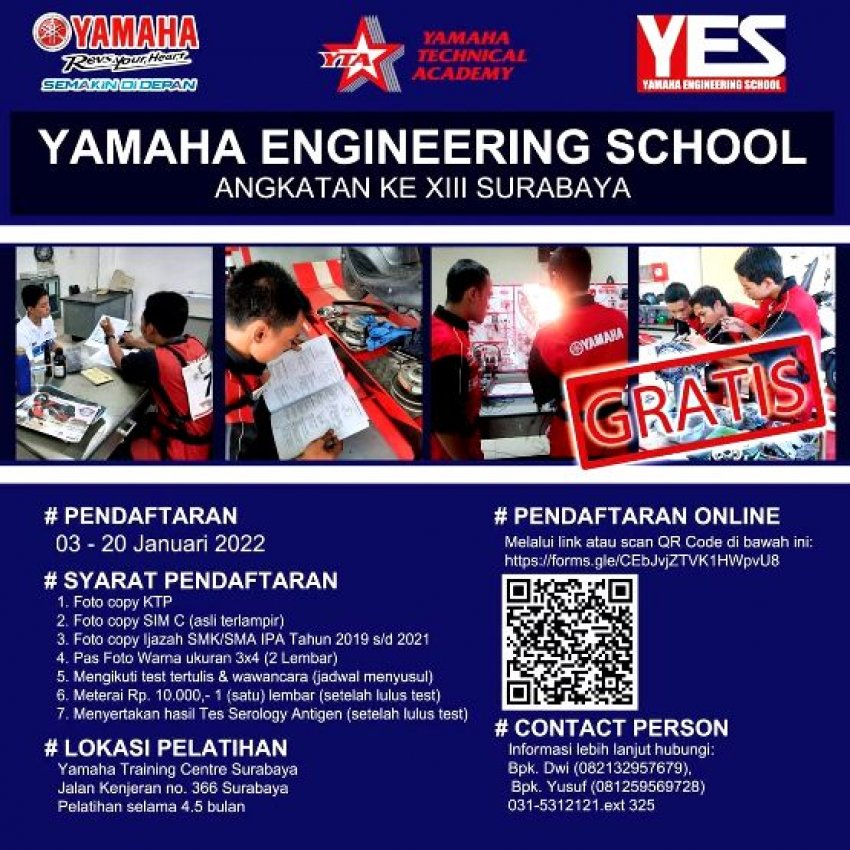 PT. Surya Timur Sakti Jatim atau Yamaha STSJ kembali membuka pendaftaran untuk Yamaha Engineering School (YES) di tahun 2022.