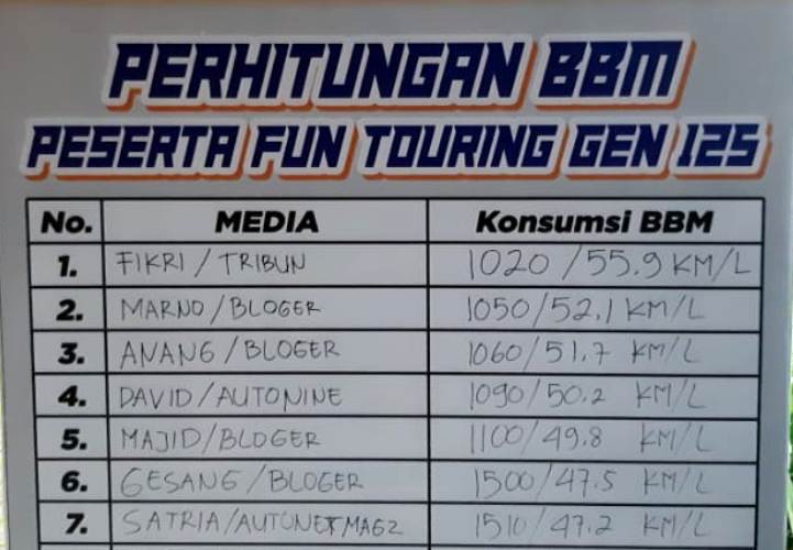 Autonine puas di urutan ke 4, dengan akumulasi pemakaian bahan bakar 1090 cc. Dengan konversi rata-rata setiap 1 Liter-nya mampu menembus 50,2 KM. Dan di urutan pertama 1020 cc, dengan konversi rata-rata 1 liter di 55,9 KM.