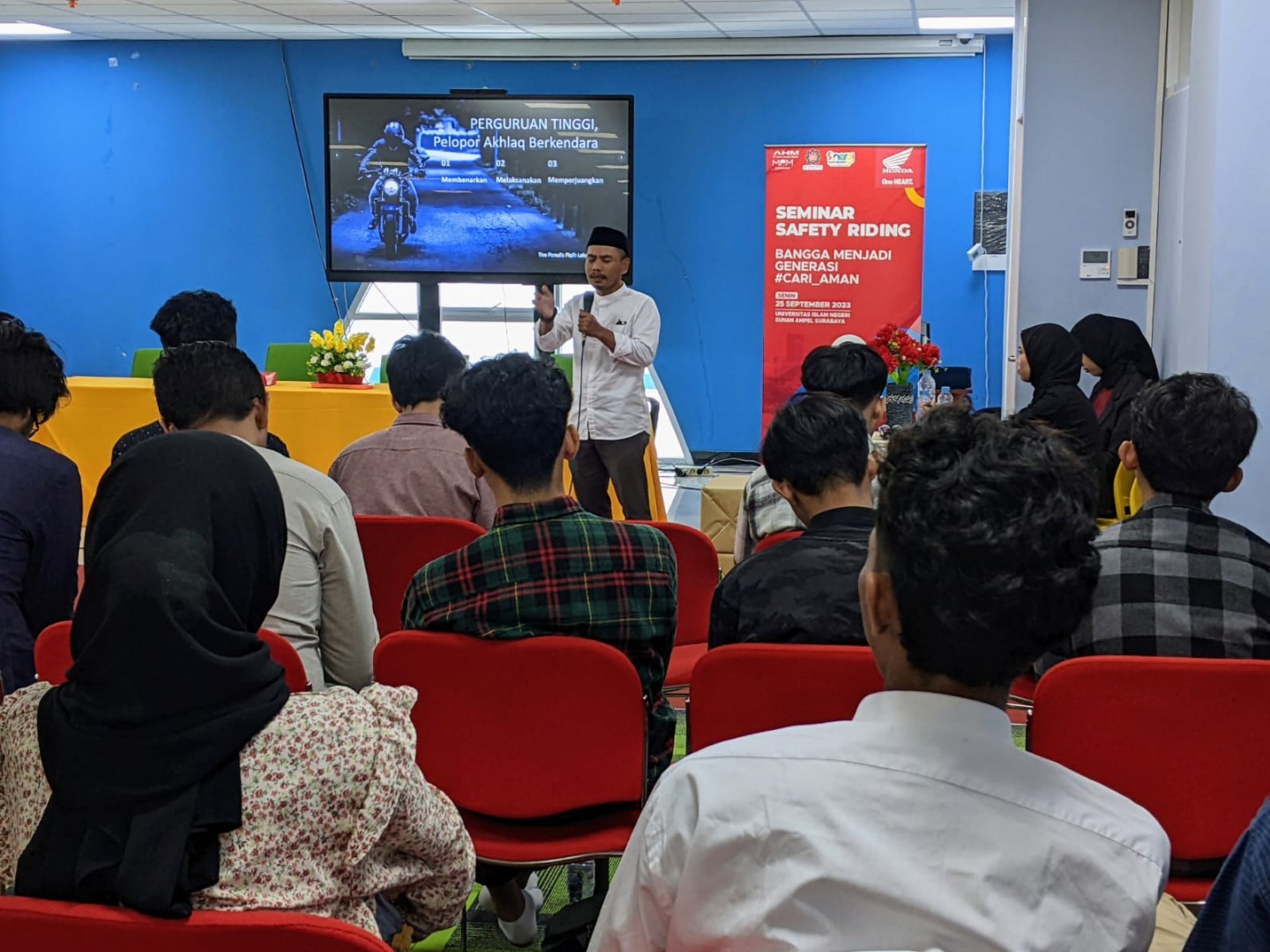Pada kegiatan seminar “Bangga menjadi Generasi #Cari_aman”, para peserta mendapatkan edukasi mengenai keselamatan berkendara dari para instruktur safety riding MPM Honda Jatim yang bersinergi dengan Dikyasa, Polrestabes Surabaya dan Jasa Raharja, Surabaya.