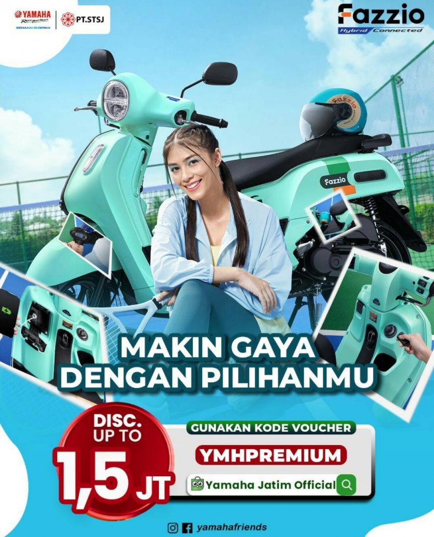 Bagi anda yang mendambakan tampilan stylish dan kece dengan motor hits masa kini, PT. Surya Timur Sakti Jatim (Yamaha STSJ) selaku main dealer motor Yamaha area Jawa Timur, Kalselteng, Kaltim, dan Nusa Tenggara memberikan penawaran spesial bagi konsumen yang melakukan pembelian motor Yamaha Fazzio Hybrid Connected.