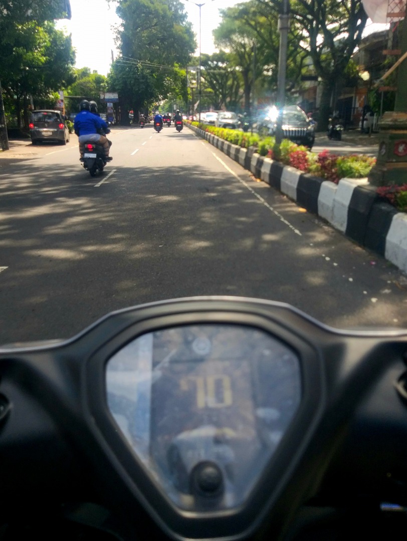Sesekali juga mengerem extrem, oleh lalu lalang kendaraan, yang nongol dari pertigaan kampung, kadang milenial memaksa masuk jalur usai nongkrong dari cafe, hingga terpangkas oleh space jalur putar balik.