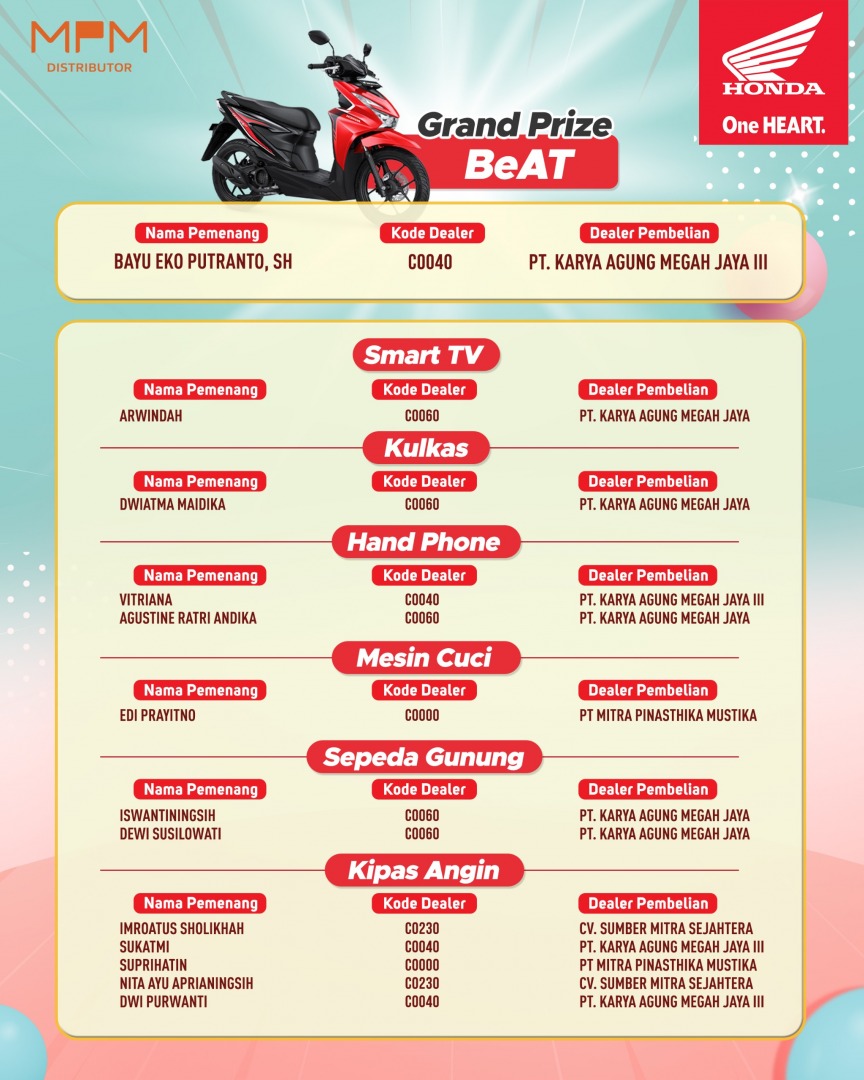 Selamat kepada para pemenang undian periode ini. Beli motor Honda sekarang, masih ada kesempatan menang pada periode berikutnya, "jelas Suhari, Marketing Communication & Development Division Head MPM Honda Jatim.