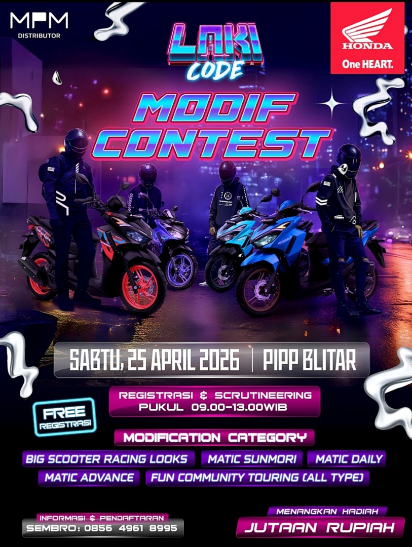 PT. Mitra Pinasthika Mulia (MPM Honda Jatim), distributor sepeda motor Honda wilayah Jatim & NTT, akan menggelar rangkaian event bertajuk “Laki Code” pada Sabtu, 25 April 2026 di PIPP Blitar.
