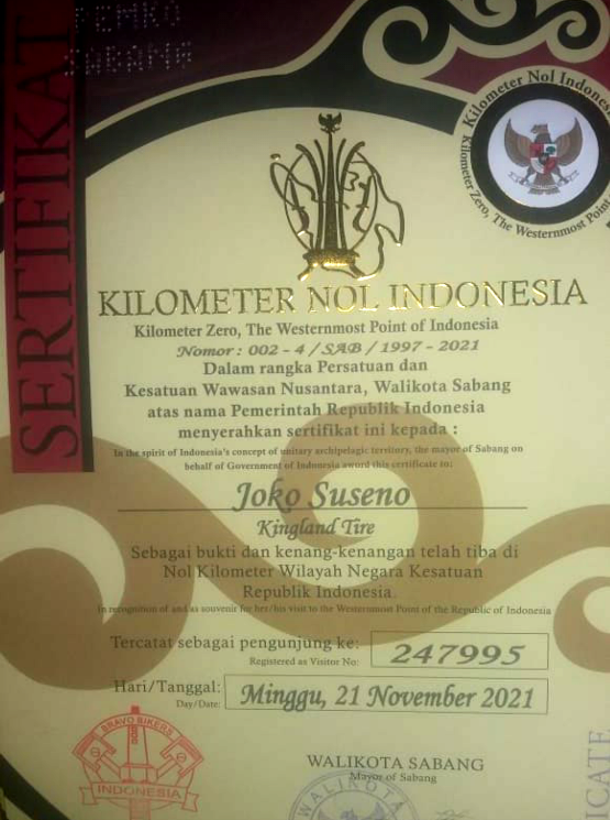 Di penghujung wilayah Indonesia ini pula, Joko bersama Team Jelajah Kebangsaan Wartawan 2021, mendapat registrasi sertifikat "Kilometer Nol indonesia".