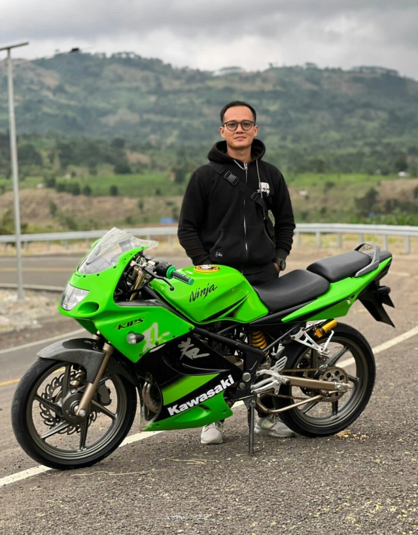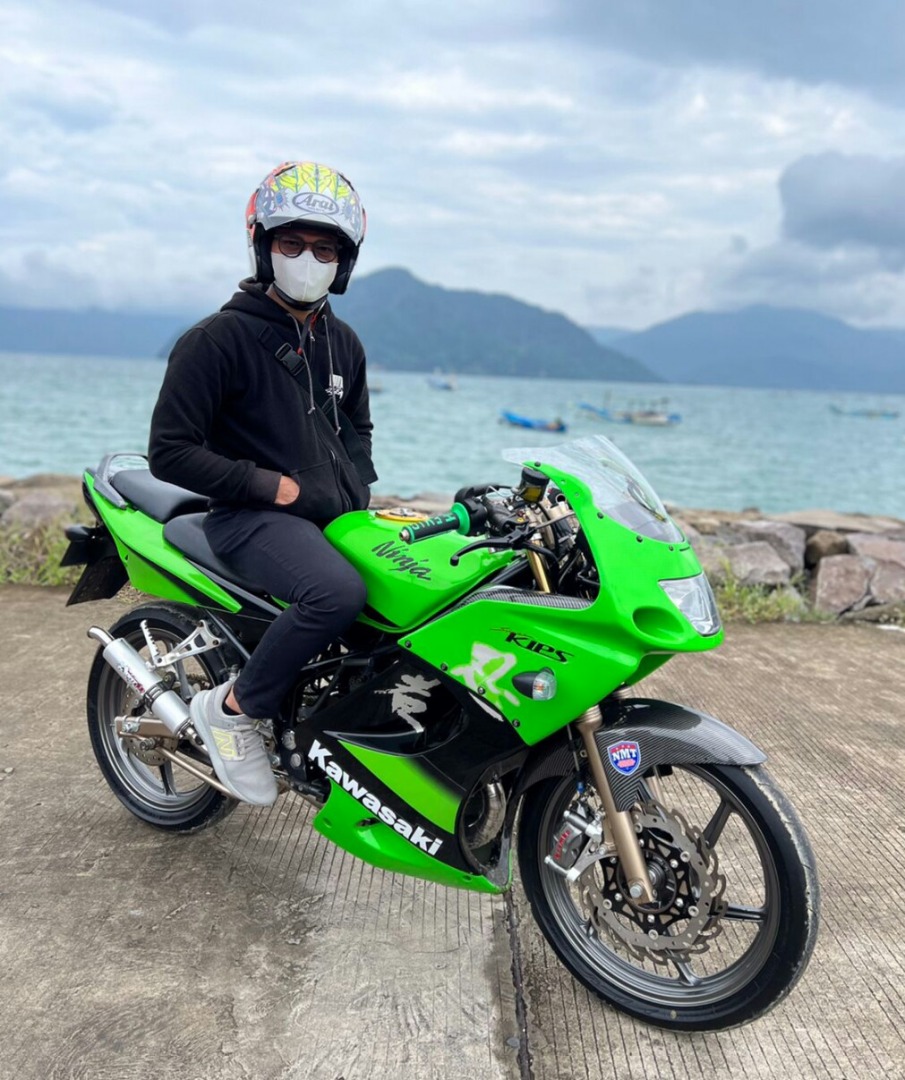 Agha dengan karakter sportynya sejak lahir, kini terlihat asyik dengan Kawasaki KRR 150.