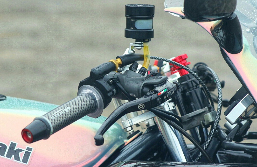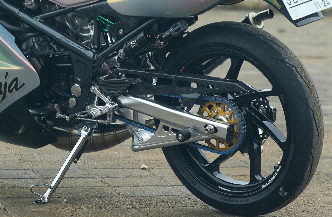 Bisa ditilik pada piranti kaki dan tapak kaki, hasil paduan triple clamp Tyga, monosok Racing Bros, swing arm B Pro, velg Marchesini 7 tipe Moto 3 Racing dan Pirelli.