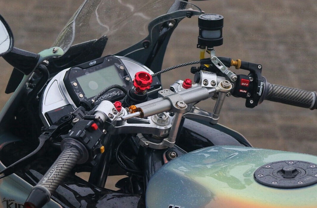 Jadi wajar, steering dumper Ohliins ikut dicangkok, mengawal cockpit yang dihuni tuas rem Brembo, tuas kopling Accosato dan setang kemudi after marketnya Kawasaki Victor 150. skg