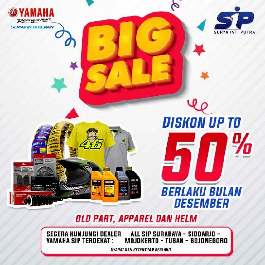 Selama ini telah menjadi semangat dan motivasi utama, dalam mempersembahkan produk yang selektif dan terbaik. Tepat di Bulan Desember ini, Yamaha Jatim berikan hadiah special, berupa dikson hingga 50% untuk pembelian sparepart dan apparel Yamaha.