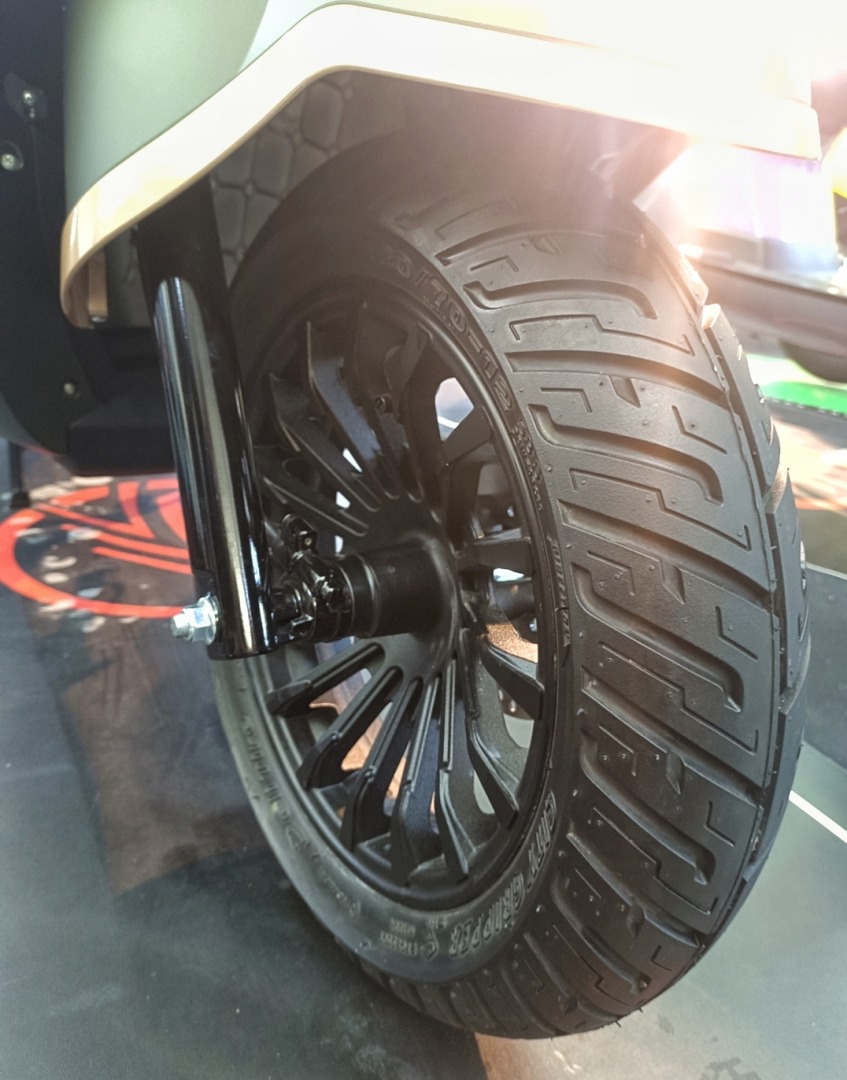 Mengapit velg 12" tipe cast wheel stylish warna hitam, dibalut ban depan belakang profil 120/70-12".