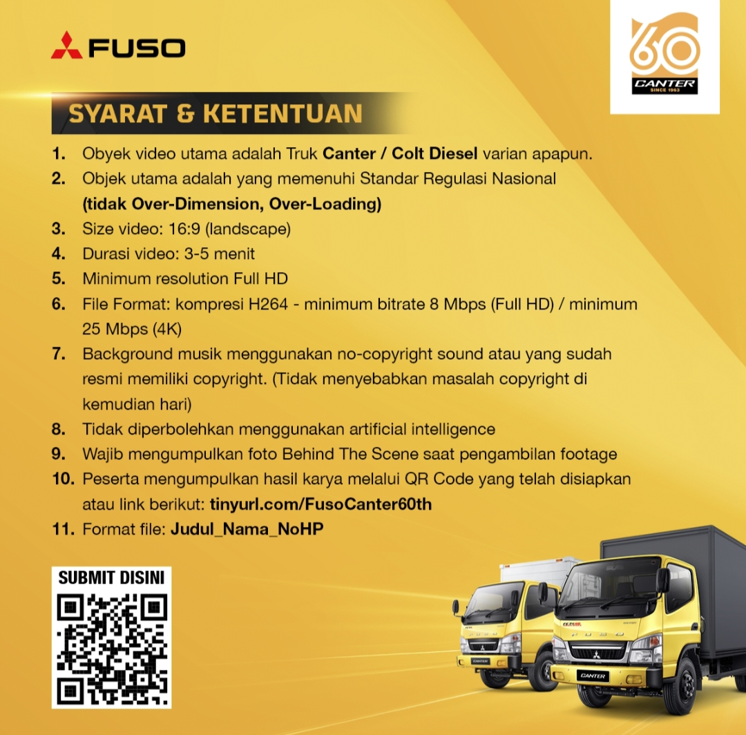 Kompetisi ini dimulai 26 Juni 2023 untuk photo competition dan 1 Juli 2023 untuk Video Competition. Syarat dan ketentuan dapat dilihat di sosial media IG @mitsubishifuso.id dan Facebok Mitsubishi Fuso Indonesia. *