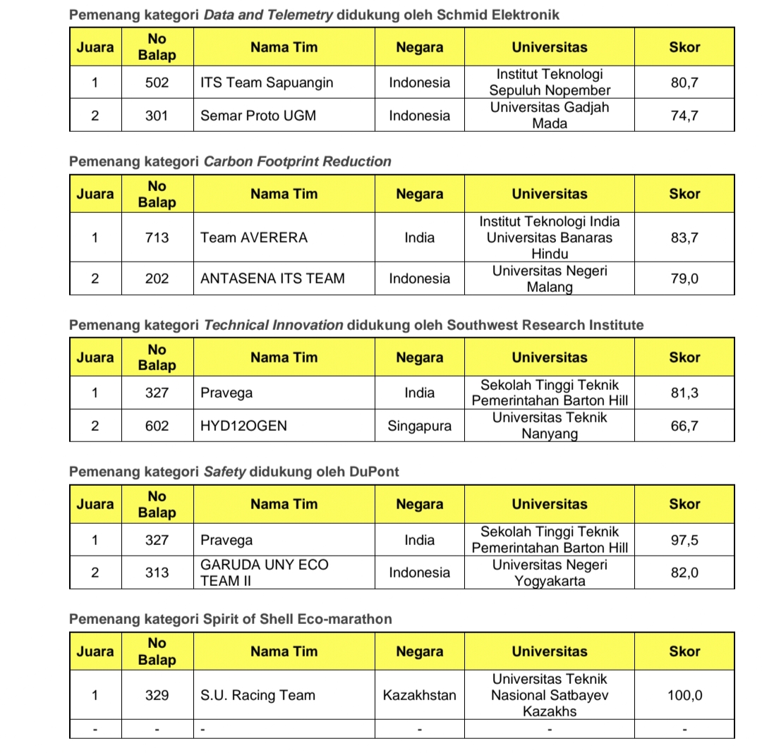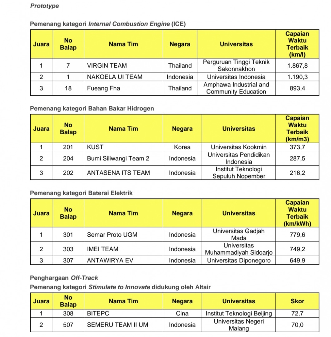 Pemenang lainnya termasuk juara bertahan Semar Proto UGM dari Universitas Gadjah Mada (UGM) dengan hasil 779,6 kilometer per kilowatt jam (km/kWh) di subkategori baterai elektrik, dan KUST dari Universitas Kookmin, Korea Selatan, dengan hasil 373,7 kilometer per meter kubik (km/m3) di subkategori sel bahan bakar hidrogen.