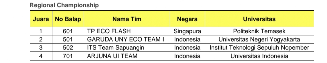 Tim-tim Urban Concept dengan efisiensi energi terbaik dalam kompetisi Regional Mileage Challenges akan diberikan alokasi energi berdasarkan hasil yang diperoleh.
