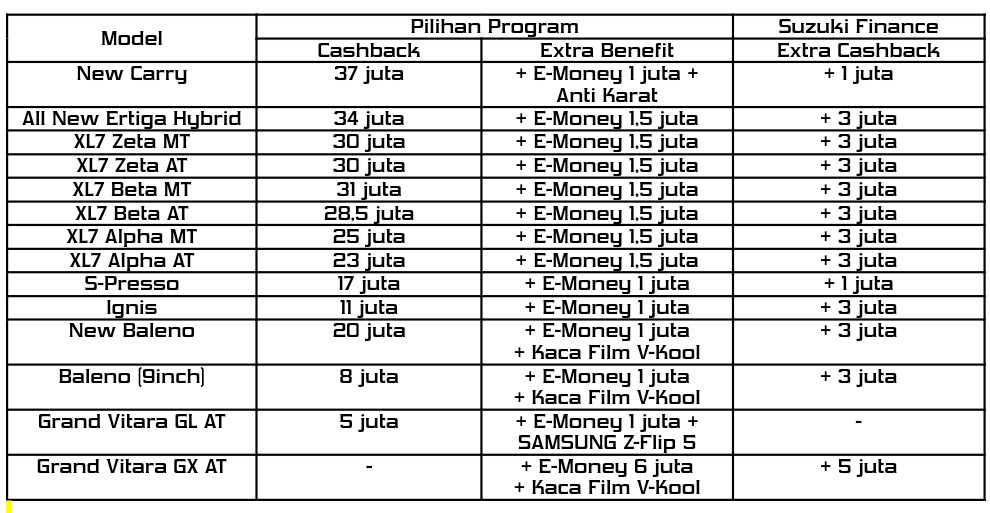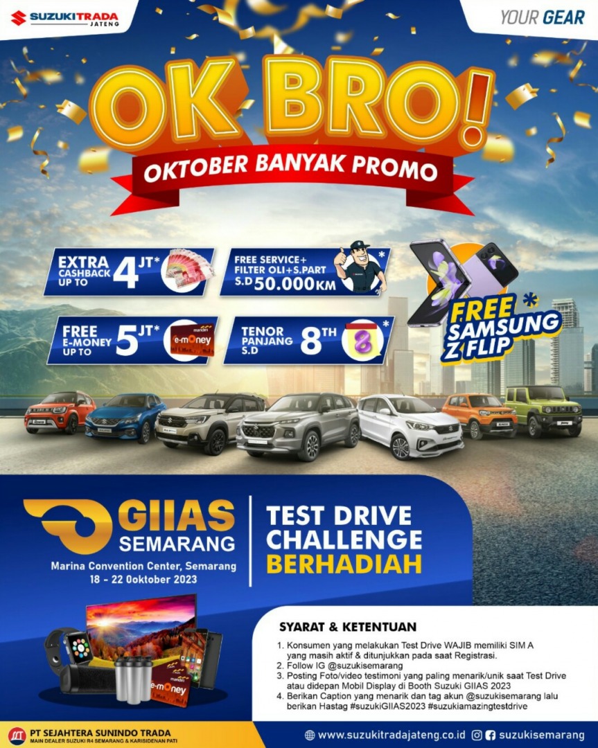 Selain promo yang secara rutin diadakan melalui jaringan diler resmi, Suzuki juga memberikan rangkaian promo menguntungkan selama GIIAS Semarang 2023 seperti berikut :