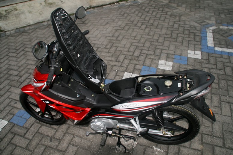 "Jadi, pemilik cukup menambahkan soft foam sebagai alas dan pelindung android di sisi dalamnya, untuk mereduksi vibra, ”tunjuk Haris. Agak ke bawah persis di sisi kanan kiri center bone, pada panel bodi ada dua tambahan console box, layaknya milik matic. Bedanya, dua console box pada Star NX 100 cc ini dilengkapi kunci pengaman, sipnya juga kedap air. Jadi, lebih pas sebagai ruang menyimpan bekal riding yang jenisnya butuh pengaman khusus.