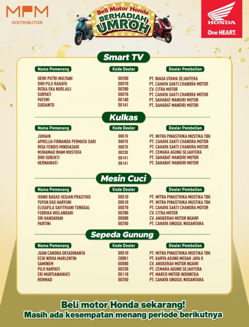 PT. Mitra Pinasthika Mulia (MPM Honda Jatim), distributor sepeda motor Honda untuk wilayah Jawa Timur dan NTT, bersama jaringan dealer Honda di Ngawi, Magetan, Madiun, Ponorogo dan Pacitan, resmi mengumumkan para pemenang program spesial “Beli Motor Honda Berhadiah Umroh” periode pembelian 1 September – 30 Oktober 2025.