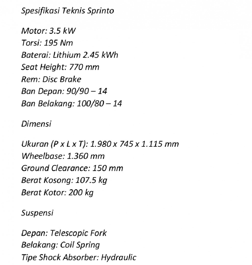 Tidak hanya mengandalkan tampilan, Sprinto dibekali tenaga yang agresif. Motor listrik 3.5 kW dengan torsi instan 195 Nm memberikan akselerasi cepat untuk kebutuhan stop-and-go di area perkotaan. *