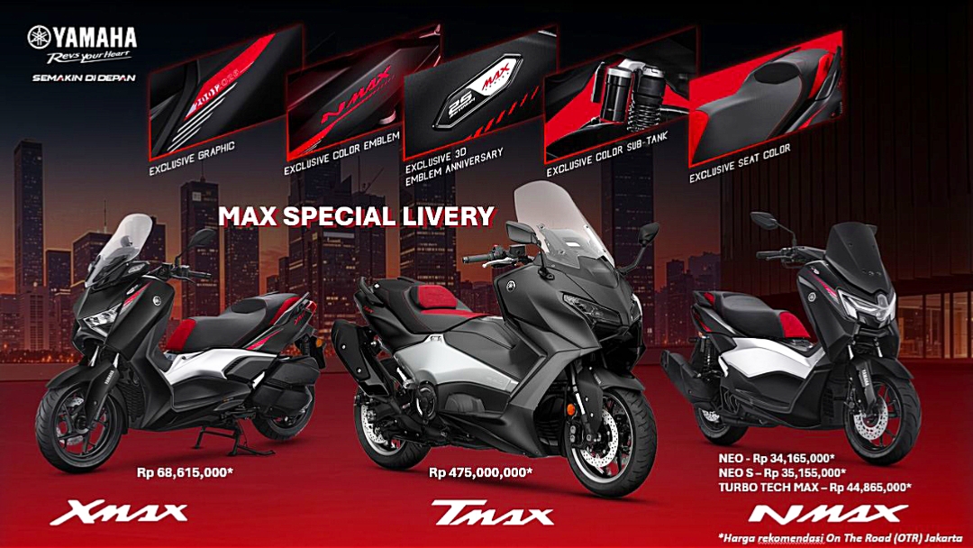 Paduan warna ini pun menjadi sajian utama MAX Special Livery yang terdapat pada model TMAX, XMAX Connected dan NMAX “TURBO”, NEO S, serta NEO.