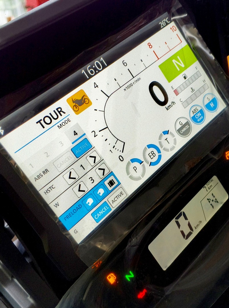 Panel meter full digital TFT 6,5 inci dilengkapi fitur Android Auto dan Apple CarPlay dengan koneksi Bluetooth, memudahkan integrasi dengan smartphone dan menampilkan berbagai informasi penting seperti riding mode, suhu udara, dan kecepatan.