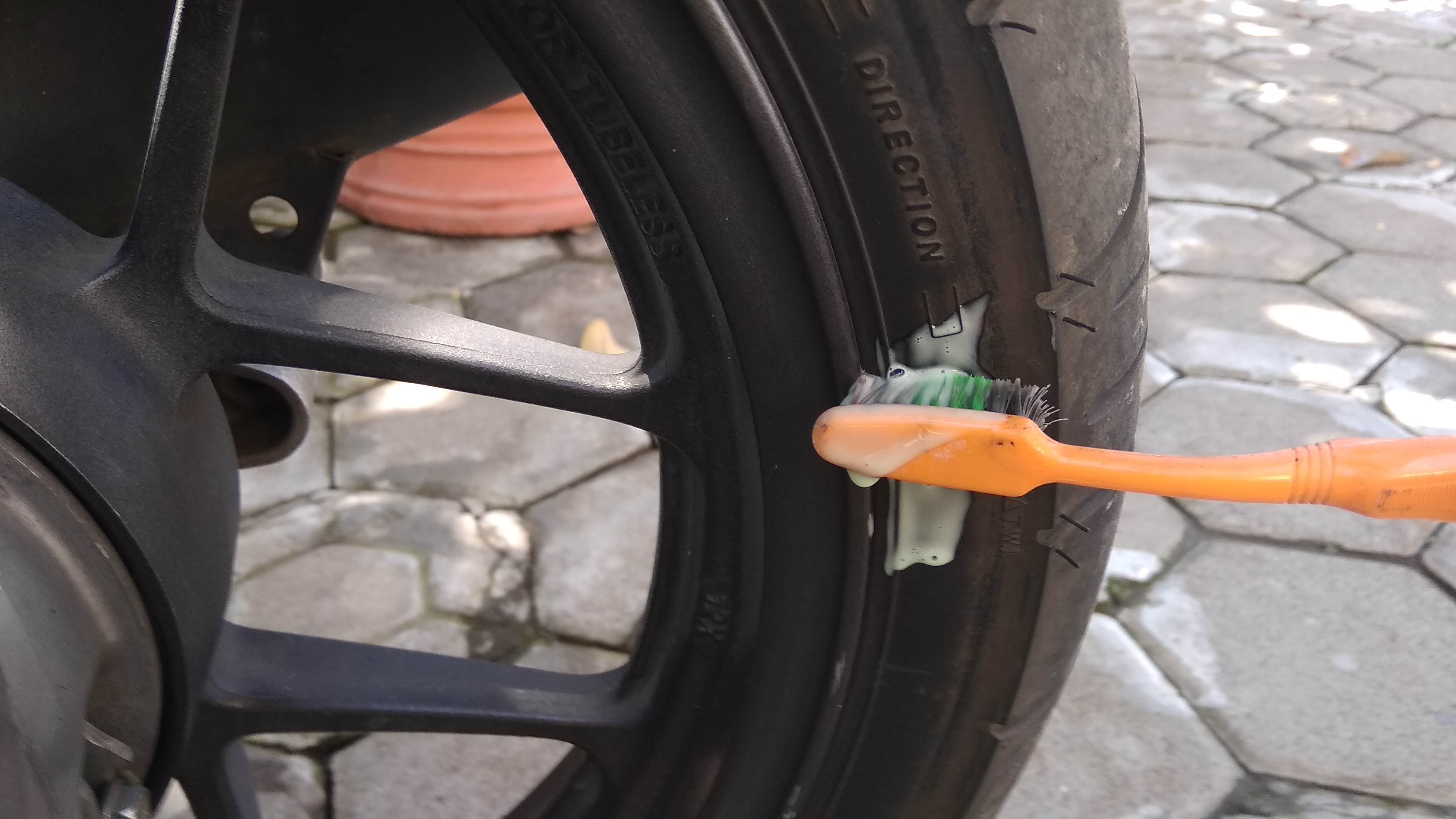 Pakai kuas atau sikat gigi bekas untuk memoleskan ke karet pinggiran ban, sikatkan satu arah atau berkali-kali. Kemudian biarkan kering, kesan mengkilap didapatkan dari minyak goreng dan lengket dari kombinasi sabun cuci cair piring serta shampoo.