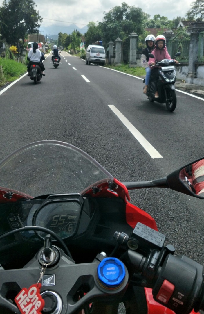 Penumpang harus memegang pegangan si pengedara depan atau memegang lutut masing-masing.