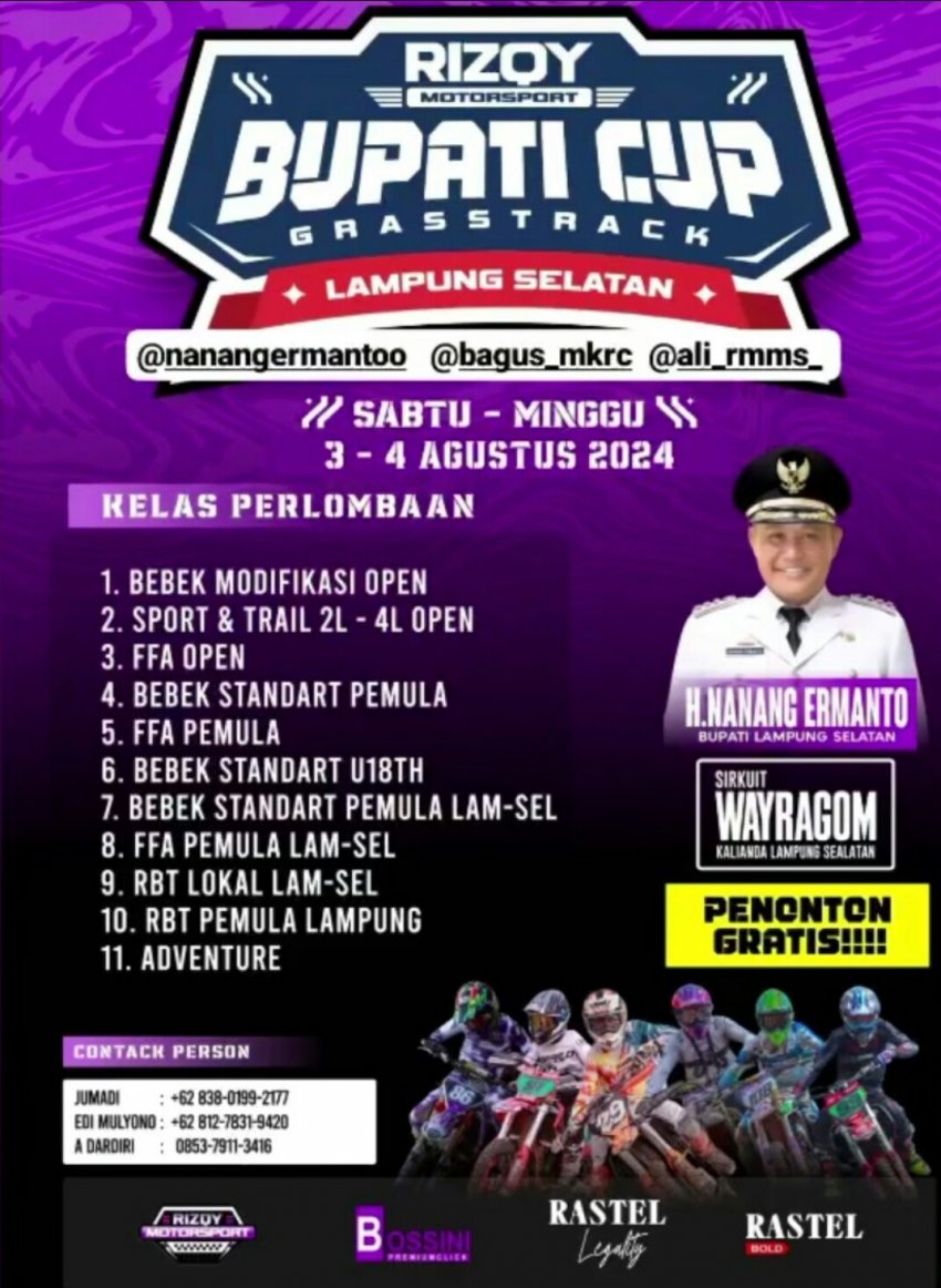 Event tahunan hasil inisiasi Big Boss H. Rokhmawan dan H. Nanang Ermanto Bupati Lampung Selatan, bersama jajaran Pemangku wilayah Lampung Selatan ini, memang tak terbantahkan, selalu antusias disambut pelaku grasstrack di provinsi Sumatera.