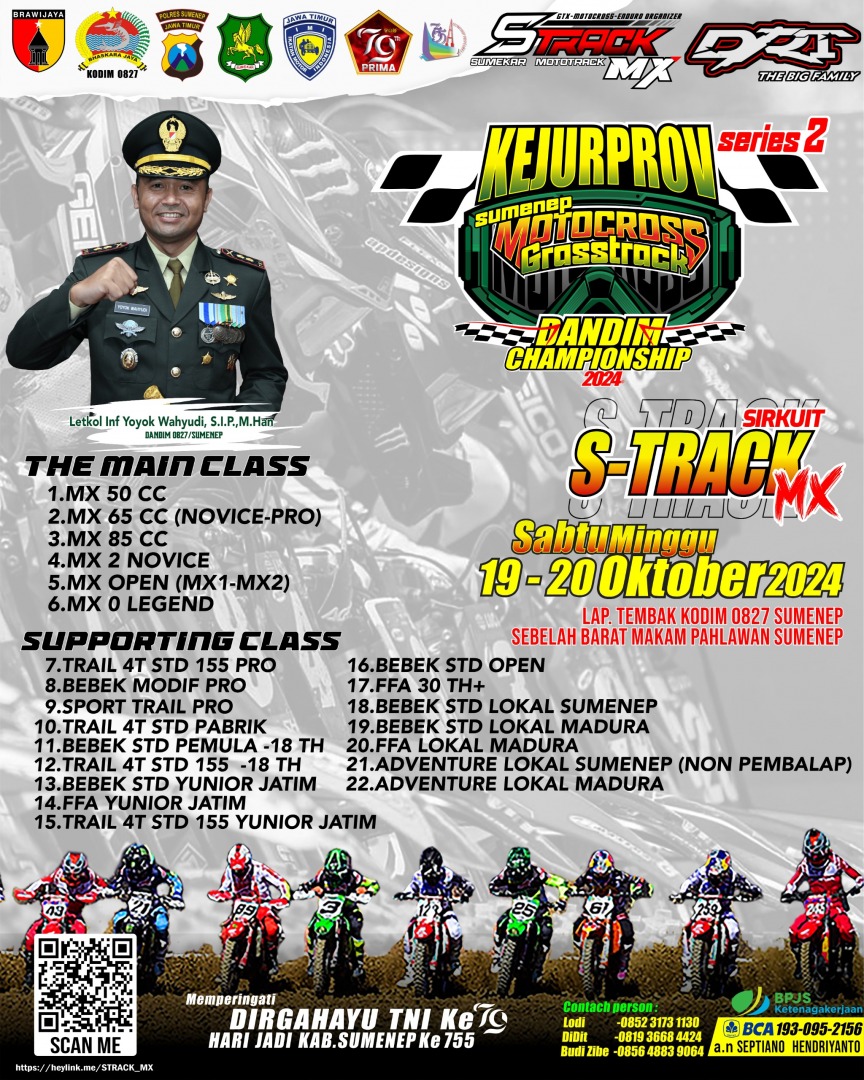 Otomatis, sepanjang sirkuit Sumekar Mototrack MX, Sumenep, kawasan lapangan tembak Kodim 0827, Sumenep venue kejuaraan, jadi makin berwarna oleh umbul-umbul, banner dan A Board, co sponsor dan sponsor, pembakar semangat para petarung.
