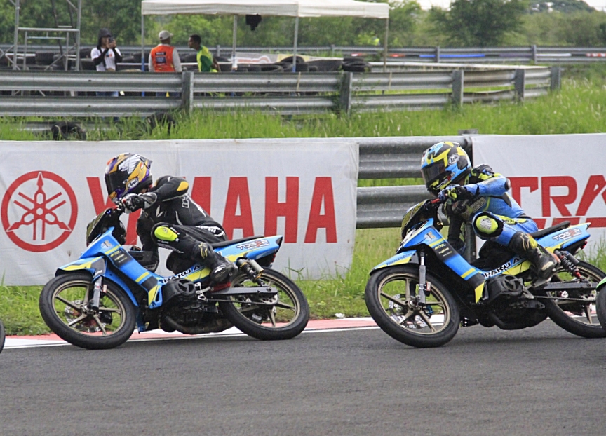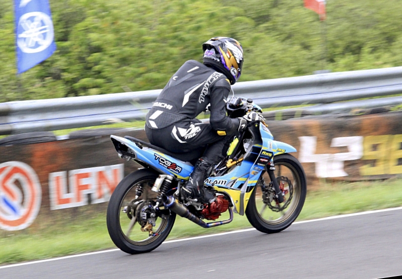 Sedang Leon Chandra begawan Racetech, tetap mengawal pacuan Rio Andrianto, di kelas Bebek 4 tak 130 cc MP2 Expert.
