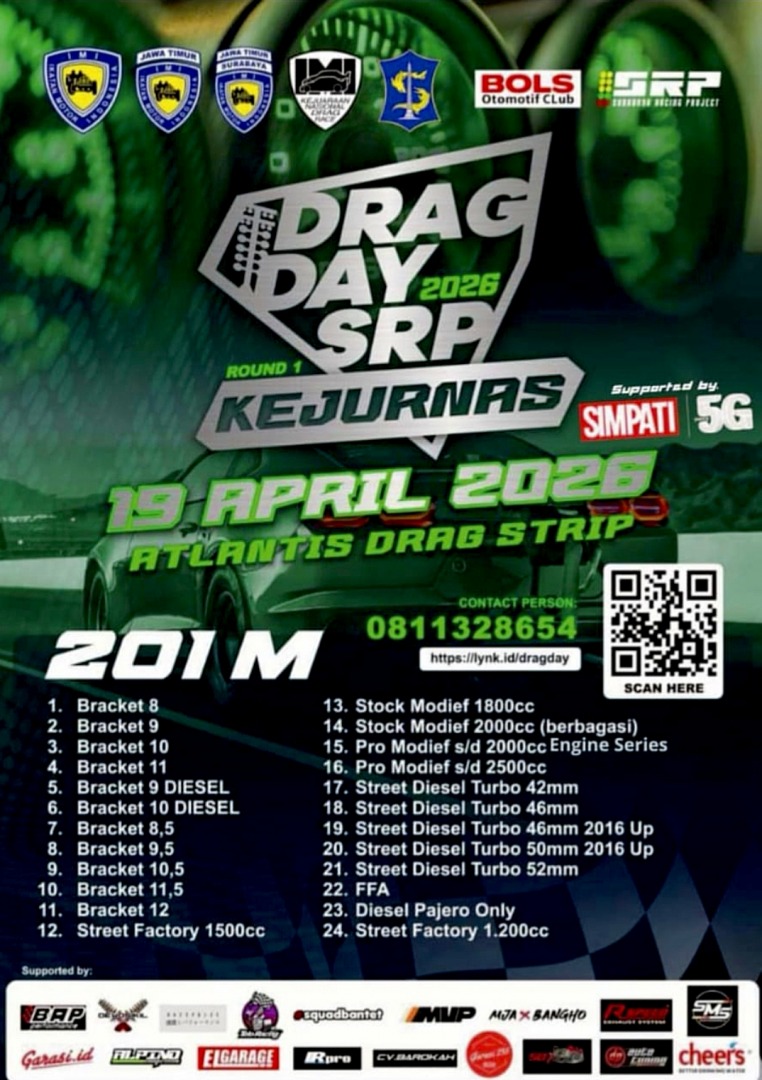 Putaran pembuka Kejuaraan Nasional (Kejurnas) Drag Race Indonesia 2026 resmi digelar pada 18-19 April di Sirkuit Non Permanen Atlantis Kenjeran, Surabaya, Jawa Timur.